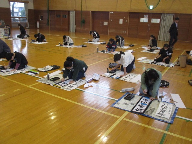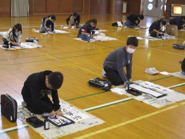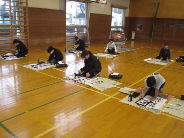 6年生の2時間目前半は、校内書き初め大会でした。体育館で「新春の志」という字を集中して書いていました。