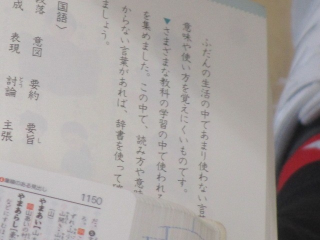 6年生の2時間目は、国語科の学習でした。「意図」や「要旨」、「討論」等の普段の生活の中であまり使わない言葉の意味を辞書を使って調べていました。
