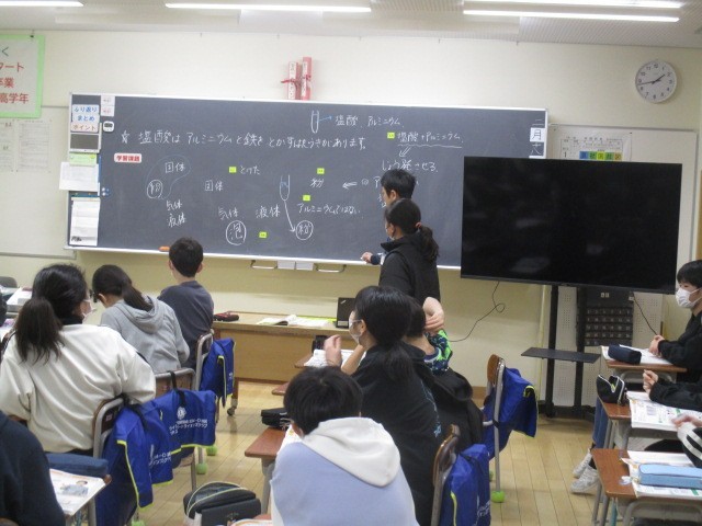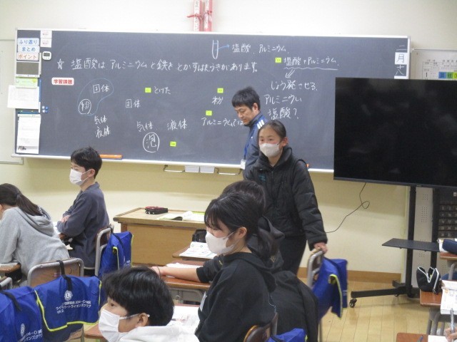 6年生の5時間目は、理科の学習でした。塩酸に溶けたものについて話し合っていました。