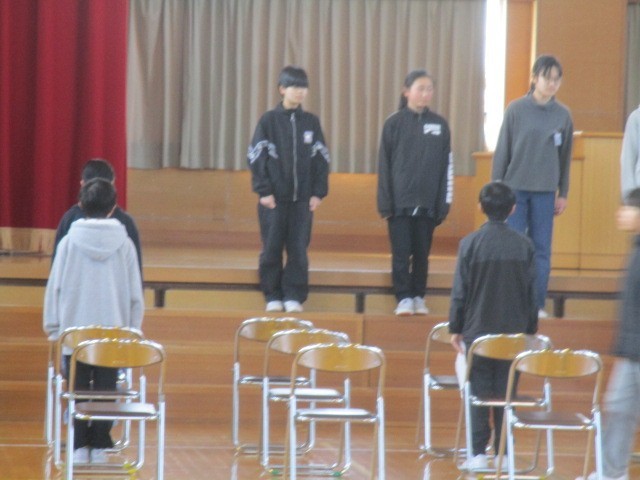 6年生は、5時間目に体育館で音楽科の学習をしていました。先生が…、元担任の…。卒業式で歌う歌の練習の前に…。木とリス…。みんな楽しそうに活動していました。