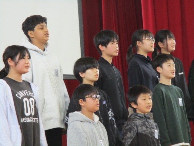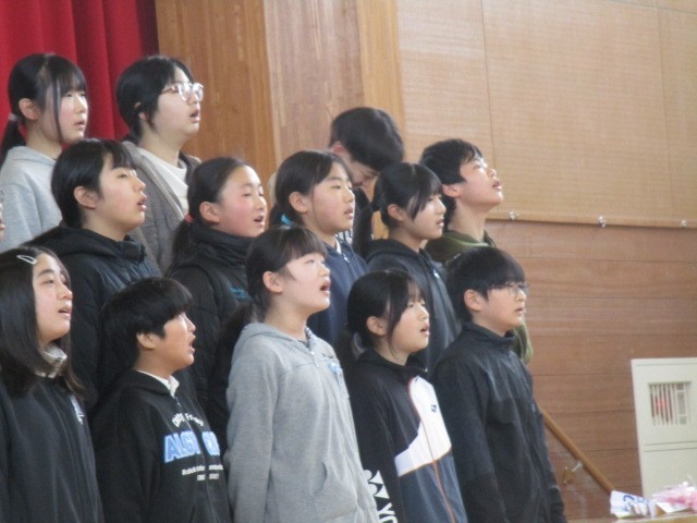 進行の「6年生さんの退場です。」のアナウンスの後、6年生さんから「ちょっと待った!」の声が、お礼に歌を聴いてくださいということでした。一生懸命に歌ってくれている姿にみんな見とれていました。