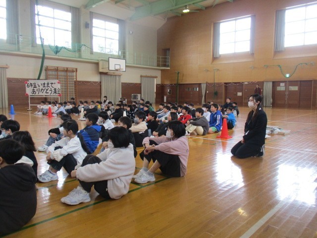 6年生は、5時間目に体育館で音楽科の学習をしていました。先生が…、元担任の…。卒業式で歌う歌の練習の前に…。木とリス…。みんな楽しそうに活動していました。