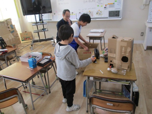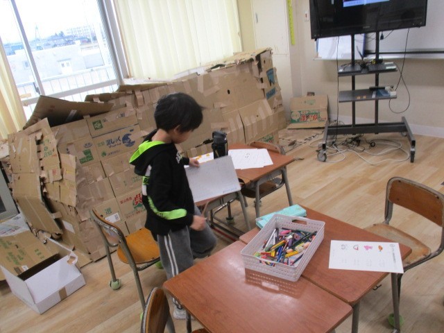 つばめ野級2組の1時間目は、図画工作科の学習でした。絵を描いたり、段ボールハウスをつくったりしていました。