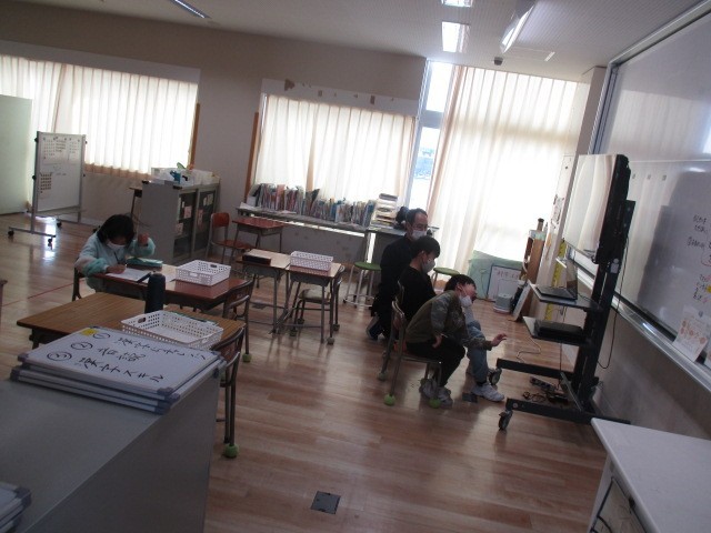 つばめ野級2組の1時間目は、それぞれの活動を進めていました。交流級で体育科の学習をしたり、片付けをしたり、先生に相談したりしていました。