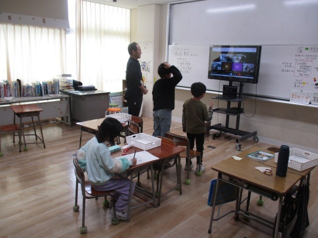 つばめ野級2組の3人は、9:00から和合地区の他の学校とオンラインでつないで、交流会を行いました。じゃんけんをしているところでした。