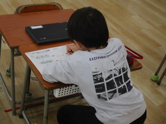 つばめ野級2組の3時間目は、プリントの時間でした。絵や数字のプリントを進めていました。