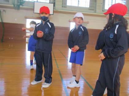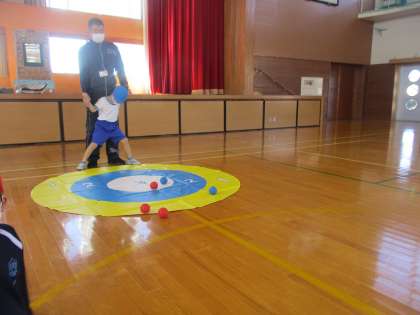 1年生向けにルールを変え、みんなで交互にボールを投げて点数を競いました。 -