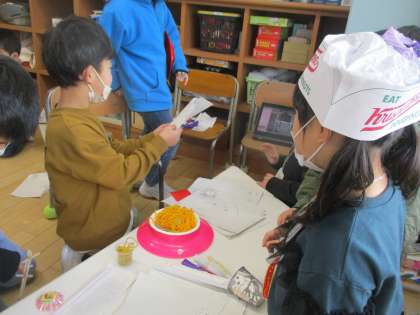 今日は、待ちに待ったお店屋さんの日でした。自分のお店を開いて、お客さんを呼び込んだり、友達のお店に行ってよいところを見付けたりしました。職員室に行って、先生達を招待している子供もいました。終わった後は、楽しかった!と満足そうな顔をしていました。