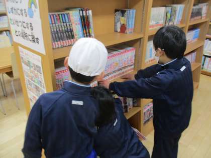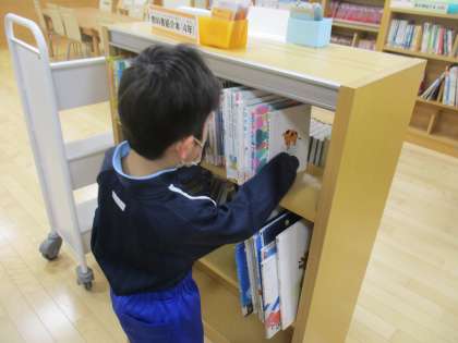 いつもお世話になっている先生方に感謝の気持ちを伝えるために、自分たちにできることを考えて行動することを決めた1年生たち。今日は、お手伝いグループが、朝のきらきらタイムに図書室の本を整頓していました。