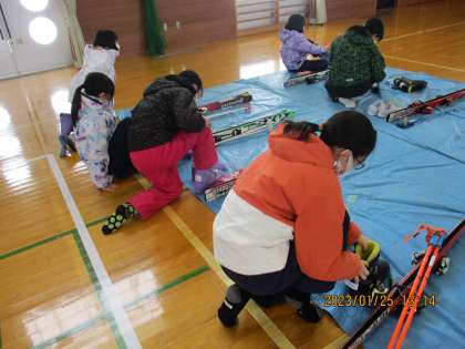 27日(金)に予定している4・5・6年生のスキー学習に向けて、体育館でスキーのフィッティングをしました。