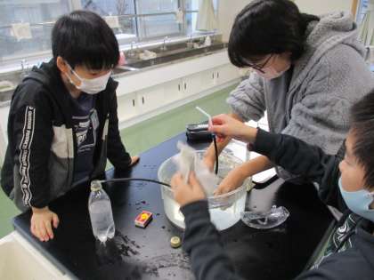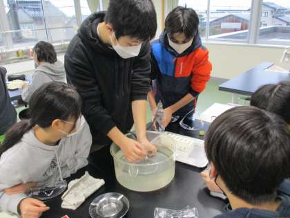 理科では、水溶液のはたらきについて調べています。今日は、炭酸水には何が溶けているのかを調べました。炭酸水から出てきた泡を集め、その気体に石灰水を入れたり、火がついた線香を入れたりして、実験しました。子供たちは、泡が二酸化炭素であることを知り、よく飲んでいる炭酸のジュースなどには、二酸化炭素が入っていることに驚いていました。