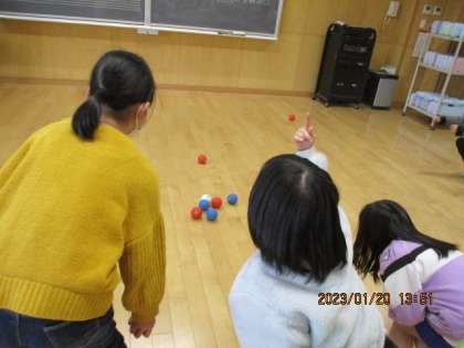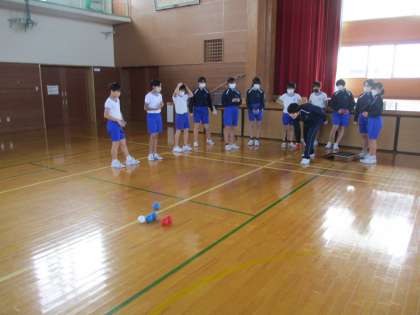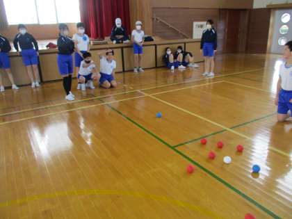 今日は、ボッチャを体験しました。ジャックボールに自分たちの球を近づるルールでゲームをしました。ただ転がすだけではなく、白い球を動かすのか、味方の球を動かすのかなど様々な工夫ができることに気付き、子供たちは一生懸命考えながらゲームをしていました。