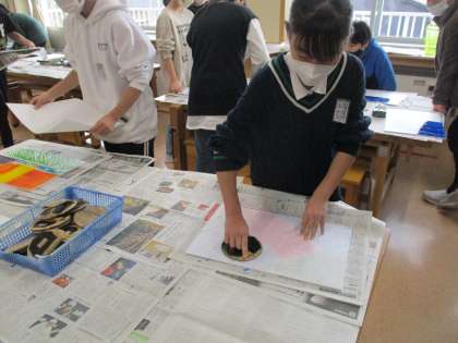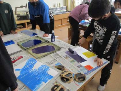図画工作科では、「版から広がるわたしの思い」の学習をしています。今日は、インクをつけて刷りました。背景は、1〜3色選んで、刷りました。子供たちは、初めはどんな具合になるか分からず、様子を見ながらしていましたが、後半はいろいろな色を試して楽しんで印刷していました。