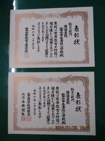 1月26日(金)に、本校が令和5年度健康教育実践優良学校の総合の部門において、健康教育実践優良校の準優良学校として富山県教育委員会より表彰されました。