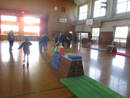 体育科では、いろいろな跳び箱遊びを体験した子供たちが、団ごとに自分たちで場を考えることに挑戦しました。「ここをジャンプするのが楽しい。」、「これ、できるとおもしろいよ。」など、作り上げた場を十分に楽しんでいました。準備・片付けもすばやく協力して行うことができました。