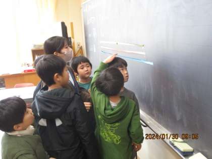 紙テープに写し取った自分の身長を黒板に貼ってみて、