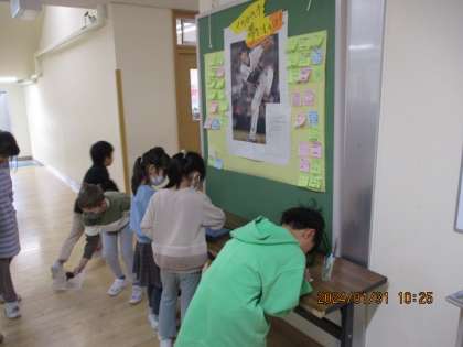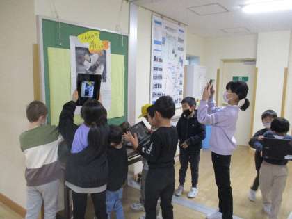 今日は朝から、グローブが飾られている児童玄関横廊下が大賑わいでした。