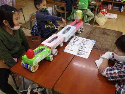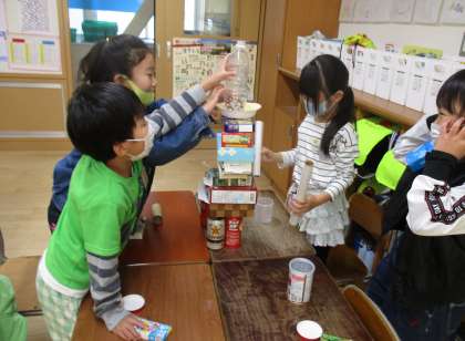 算数科「かたちあそび」の学習で、持ち寄った空き箱や空き缶を使って形遊びをしています。グループの友達と電車やタワーなどを楽しく作っています。形遊びをしながら、いろいろな形に関心をもってほしいと思います。