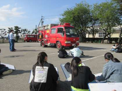 倉垣消防団の分団のシャッターに描かれる消防車のスケッチ中です。みんな目の前の消防車をじっくりと観察しながら、描き始めています。