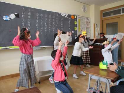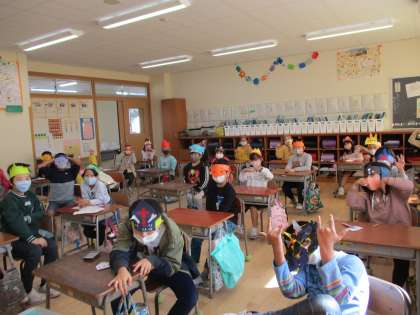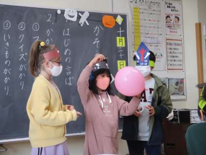 2年生では、一足先にハロウィンの仮装大会をしました。図画工作科で作ったかぶりものをつけて、学級会の時間に係ごとに出し物をしました。