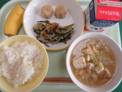 10月最後の給食は、レバニラいため、かにシューマイ、中華スープ、バナナでした。