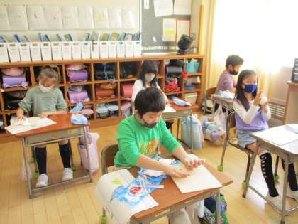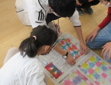 子供たちが開催したおりぞめ教室に参加しました。コンピュータで写真入りの説明スライドをつくったり、実演しながらポイントを説明したりしてくれたおかげで、参加した先生方はきれいなおりぞめを楽しむことができました。