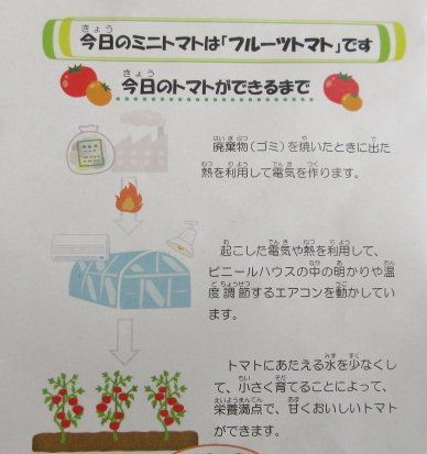 今日の給食のミニトマトは、株式会社富山環境整備から寄附していただきました。「フルティカ」という品種のフルーツトマトです。甘くておいしいですね。