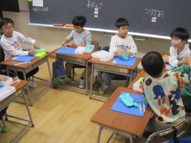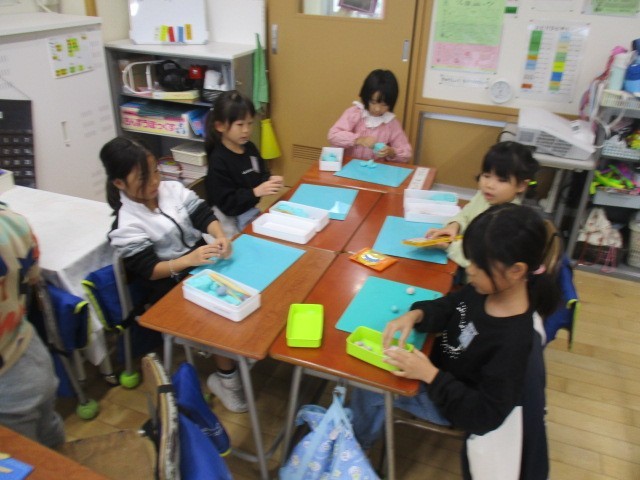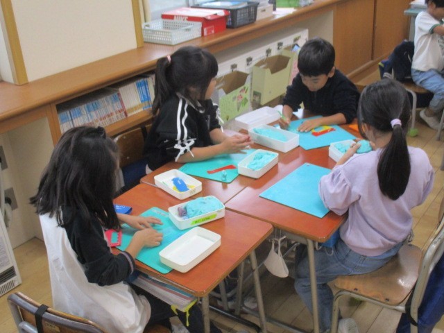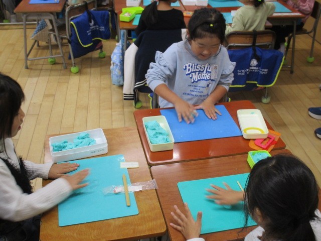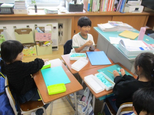 1年生は、3時間目にお店屋さんを開こうとしていました。お店ごとに品物を粘土でつくるところでした。