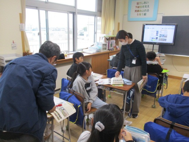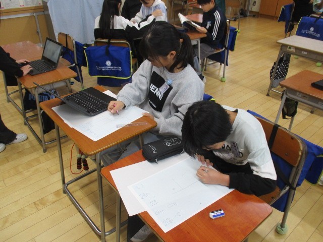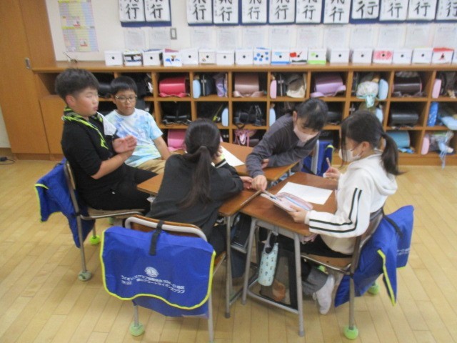 5年1組の5時間目は、国語科の話合いをもとにして活動していました。ポスターをかいたり、話合いを更に進めたり班ごとに活動していました。