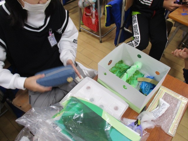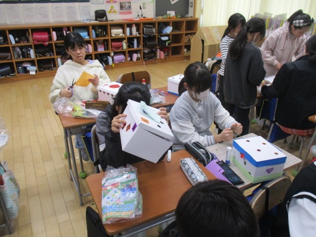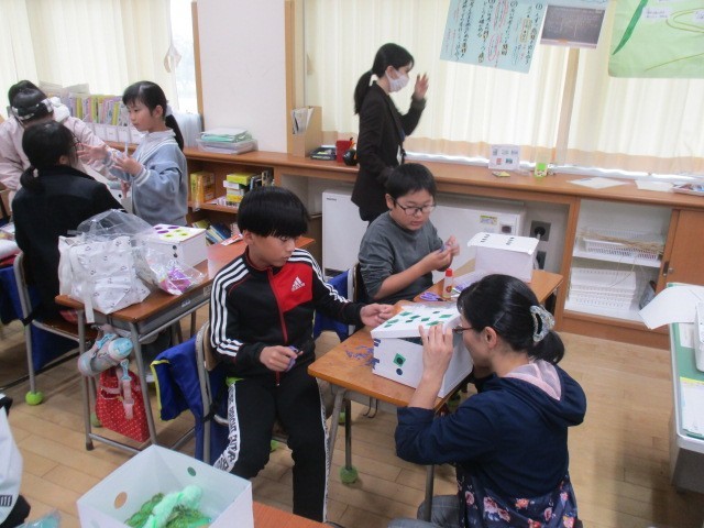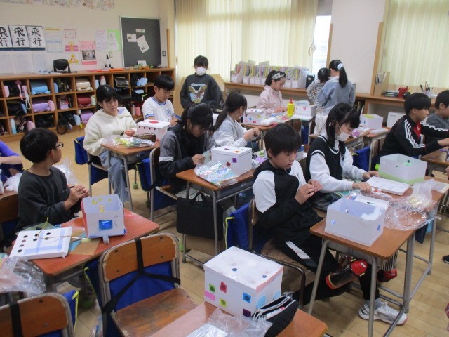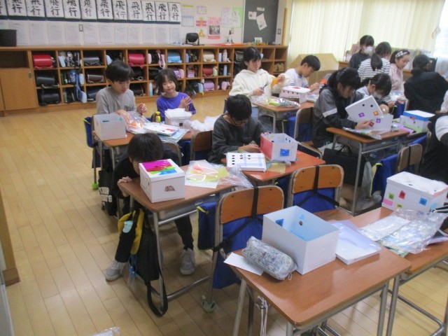 5年2組の3時間目は、図画工作科の学習でした。箱の穴からのぞいたときに見える世界をつくっていました。