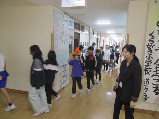 5年2組の子供たちが、5時間目に嬉しそうにグラウンドに出ていきました。全員の頭にかわいい飾りがのっていました。ハロウィンリレーをしていました。