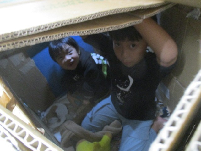 つばめ野級2組では、5時間目に今日のところの段ボールハウスを紹介してくれました。室内に電気があるそうです。
