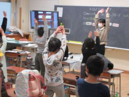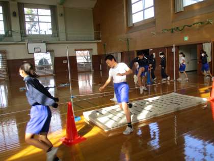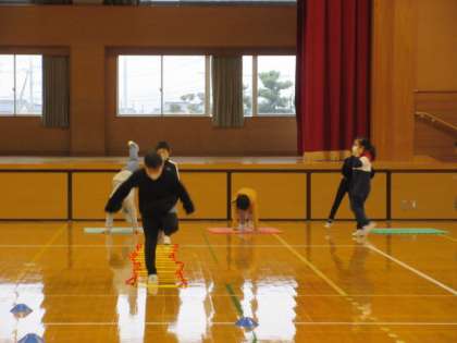 体育館でサーキットトレーニングをする学年と教室でラジオ体操する学年に分かれています。冷たい雨が降り、寒い日ですが、しっかり運動して体を温めましょう。