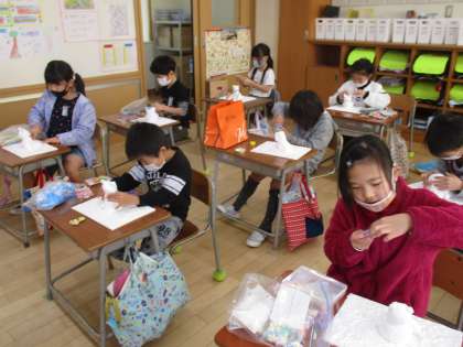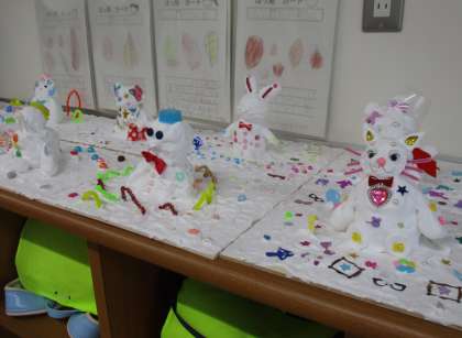 図画工作科の学習で「おしゃれなどうぶつ」を作っています。紙粘土で形を作り、持ってきた材料でいろいろな飾り付けをしました。「すごくおしゃれになったよ」「かわいくなったよ」とうれしそうに作品を見ていました。