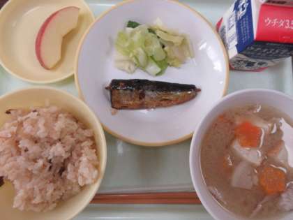 きのこごはん いわしの梅煮 野菜ソテー 豚汁 りんご