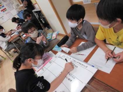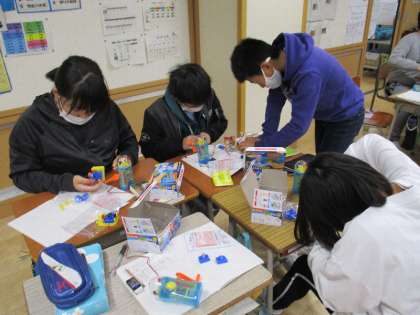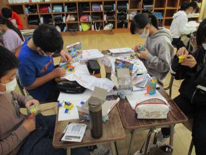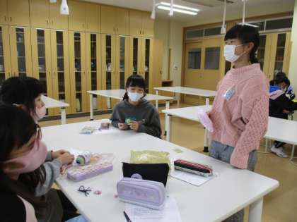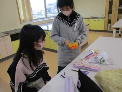 手芸クラブでは、今まで作ってきた作品をグループのメンバーに紹介しました。子供たちは、工夫したところや難しかったところなど、きちんと伝わるように話していました。