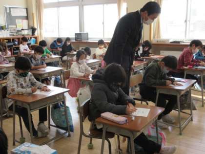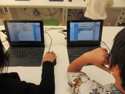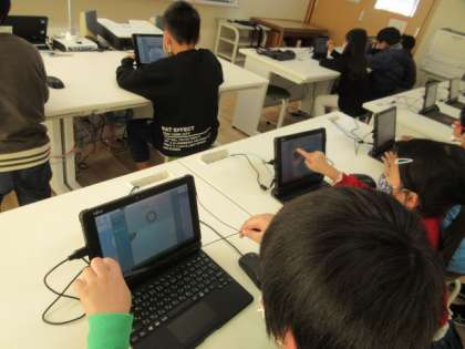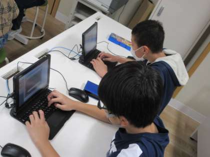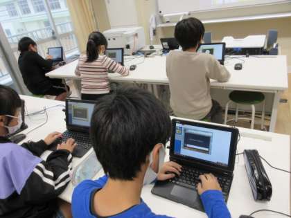 コンピュータを使って、かけ算の練習をしています。2のだんから5のだんまでの九九がアトランダムに出てくるので、みんな必死です。50問を5分間でクリアできるよう、がんばっています。