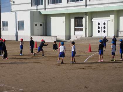 キックベースボールの練習をしています。今日は、まず、投げられたボールをけって走ること、ボールをキャッチすることを中心に練習を進めています。