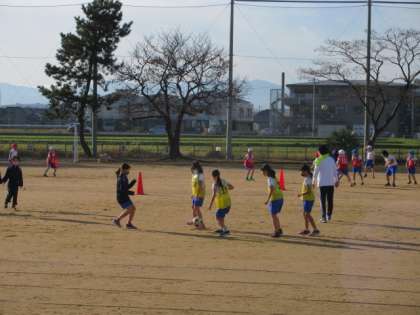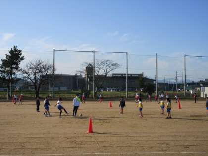 朝から青空が広がり、グラウンドでは4年生がサッカーの学習をしています。風は冷たく感じますが、子供たちは元気にボールを追いかけています。