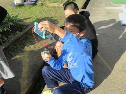 太陽の光を使って、電気をつくる学習中。光電池と器具をつなぎ、光電池に光を当てることでプロペラを回したり、電子ブザーを鳴らしたり、検流計で測定したり、楽しく活動しています。