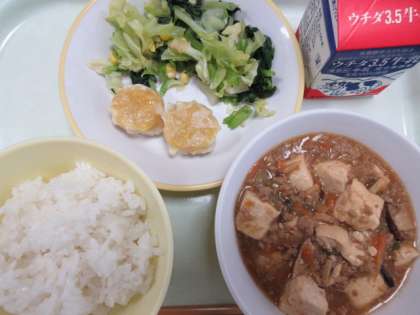 麻婆豆腐 にんじんシューマイ コーンあえ