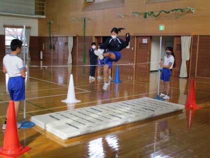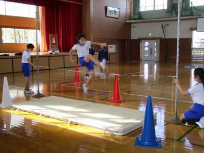 ウォーミングアップで、低い高さの連続跳びを行い、感覚をつかんだあと、身長や50メートル走のタイムから出した目標記録の高さを目安に、練習を重ねています。フォームもグループで見合いながら、ずいぶんきれいに高く跳ぶことが出いるようになってきました。高い高さを跳んだときには、跳ぶことができた子供のうれしそうな表情と共に、周りの子供たちの拍手や歓声も聞かれ、みんなでがんばっている様子がとてもすてきです。 -