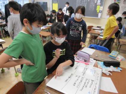 「クラスみんなで決めるには」 司会者、提案者、参加者という3つの立場に分かれ、それぞれの役割に応じた話し合いをしようと頑張っています。グループで今日の話合いをふり返り、ボードにまとめ、それをワールドカフェ方式で他のグループと共有しています。どのグループも積極的に意見を出し合い、考えを深めています。