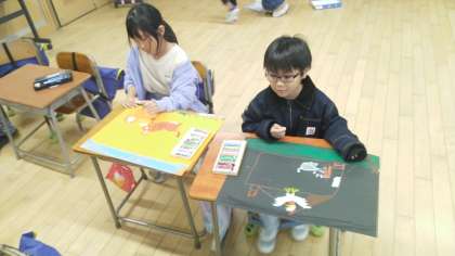 1年生の4時間目は、図画工作科の学習でした。お話の絵がどんどん完成してきていました。一人一人が、「ブレーメンの音楽隊」の好きな場面を選んで描いたそうです。