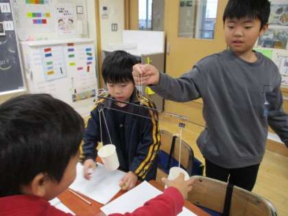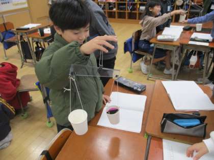 算数科では、重さについての学習をしています。今日は定規と紙コップでつくった天秤を使って、家から持ってきた物や、学校で使っている文房具等の重さ比べをしました。