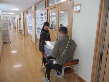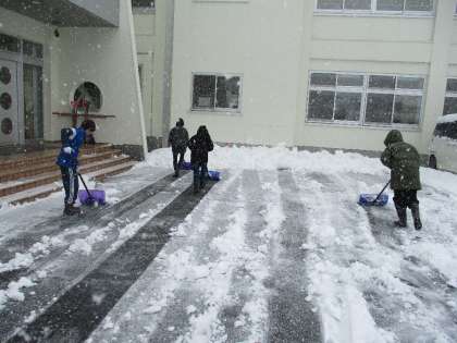 そのあとの大掃除の時間には、玄関掃除の人たちが、全校の下校に向けて玄関前の雪かきをしていました。