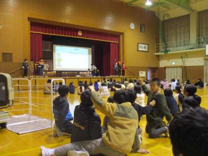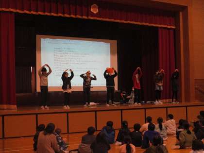 お米の消費量や米農家さんが年々減っていっていることを知り、全校のみんなに「お米を食べよう」と、劇やクイズ、歌やダンスなどで呼びかけました。発表をしっかりと見ていた他の学年の子供たちは、お米一粒一粒を大切にして、もりもり食べようという思いをもったようです。 -