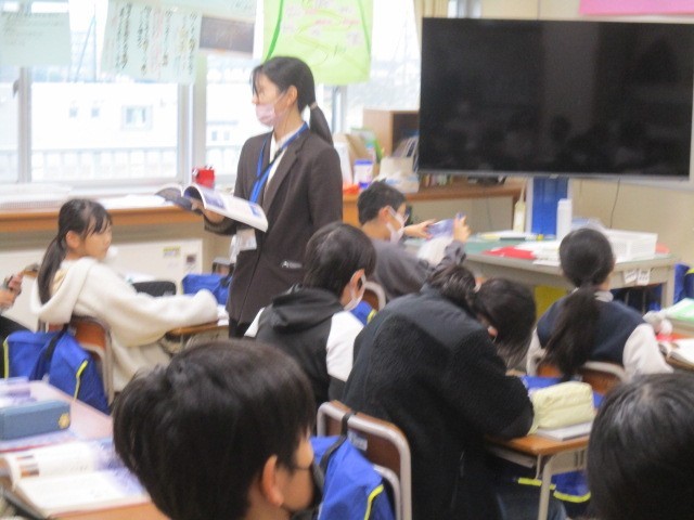 5年2組は、5時間目に図書室にいました。司書の先生の読み聞かせを聞いていました。