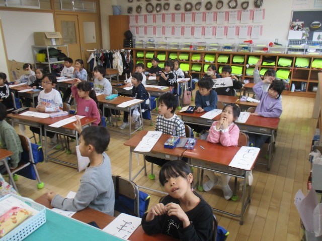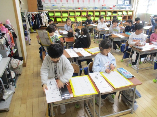 1年生の5時間目は、書写の時間でした。かきぞめの練習をするところでした。「こうま」という文字みたいです。