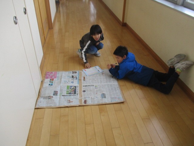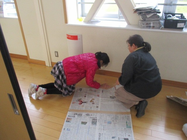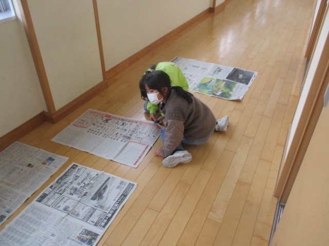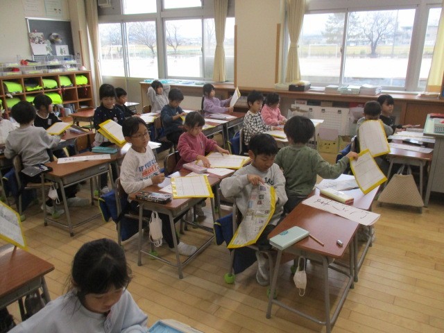 3年生の5時間目は、書写の学習でした。書き初めの際に、下敷きの下に敷く新聞紙をつくっていました。
